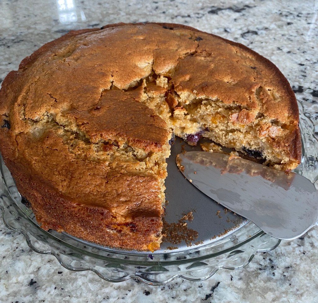 Christmas eve was special this year as we had time together. School had the day off and I had the day off of work. I wanted to make a special breakfast pie but decided to make a buckle. This one is mixed fruit consisting of peaches, pears and blueberries.