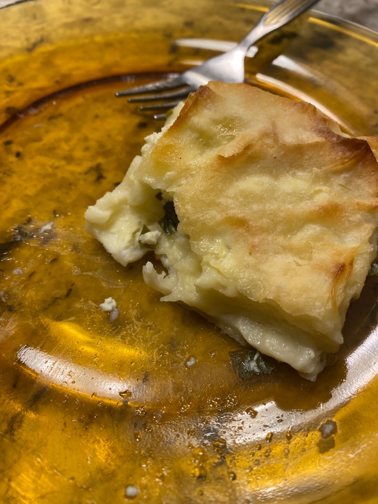 I’m continuing my theme of making savory pies. For dinner tonight, I made Su Borek or water pastry. This is one of my favorite Turkish dishes. I have a round pan that we purchased at Sevan Bakery in Watertown, most likely for baklava.