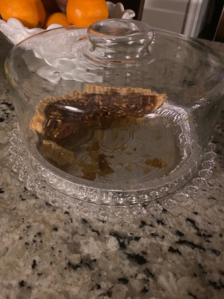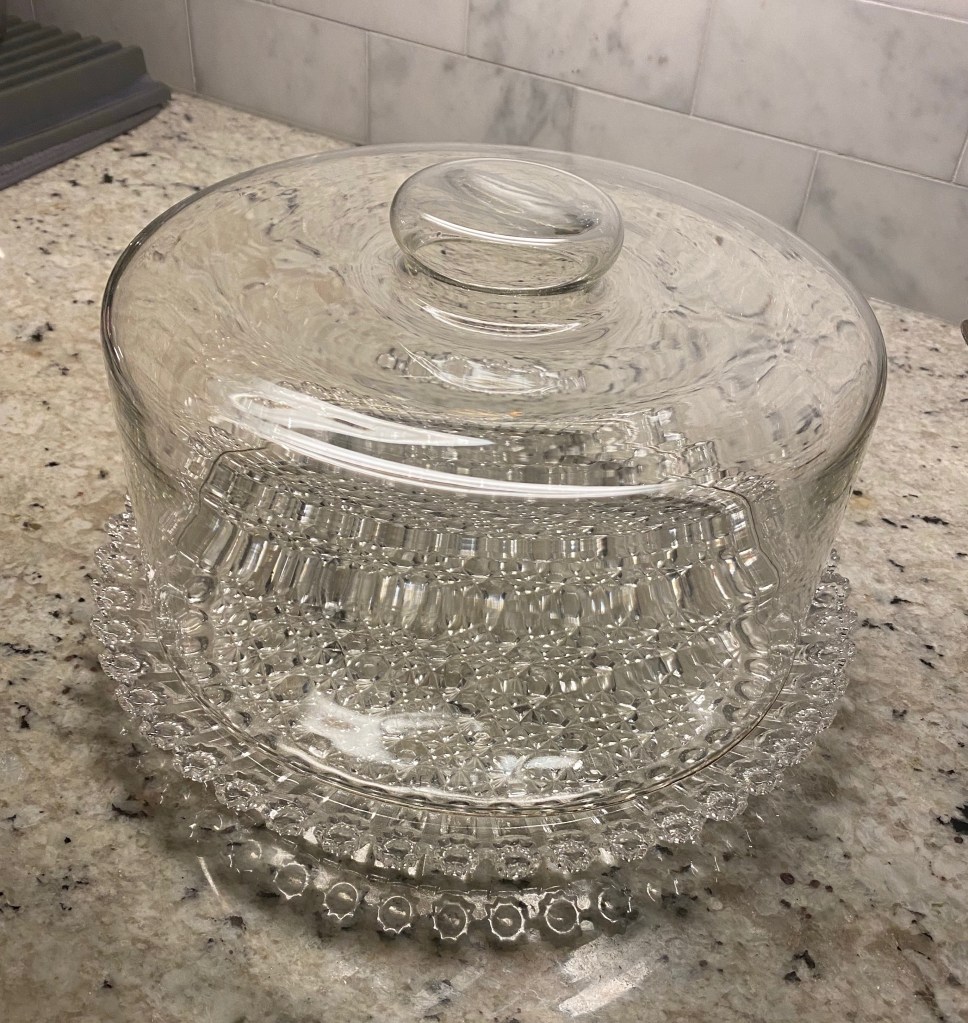I found this amazing covered plate set at a local flea market. Upon research through a glass collector group, I learned that it was actually two pieces that are not a set! The base is a Mikasa hostess platter with a glass dome that was purchased elsewhere. I love it as it is the perfect size to hold the pie from my local bakery!