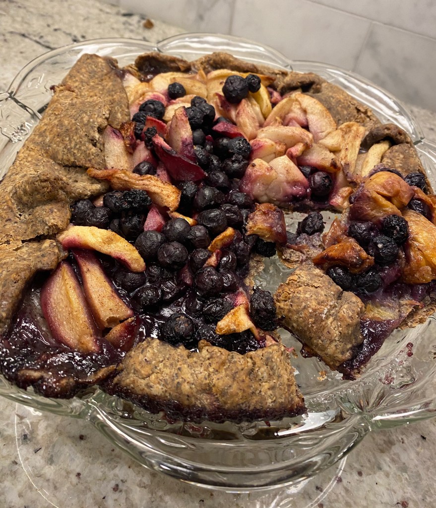 Someone once told me that pie cannot be rushed. You need to stop to pay attention to each level of production, and it is amazing when you are done. But I rushed this galette. It has apple, pear, blueberry, and mulberries in the filling. During baking, the wall slumped because I didn’t chill it enough. The filling ran all over the baking sheet and caramelized underneath.