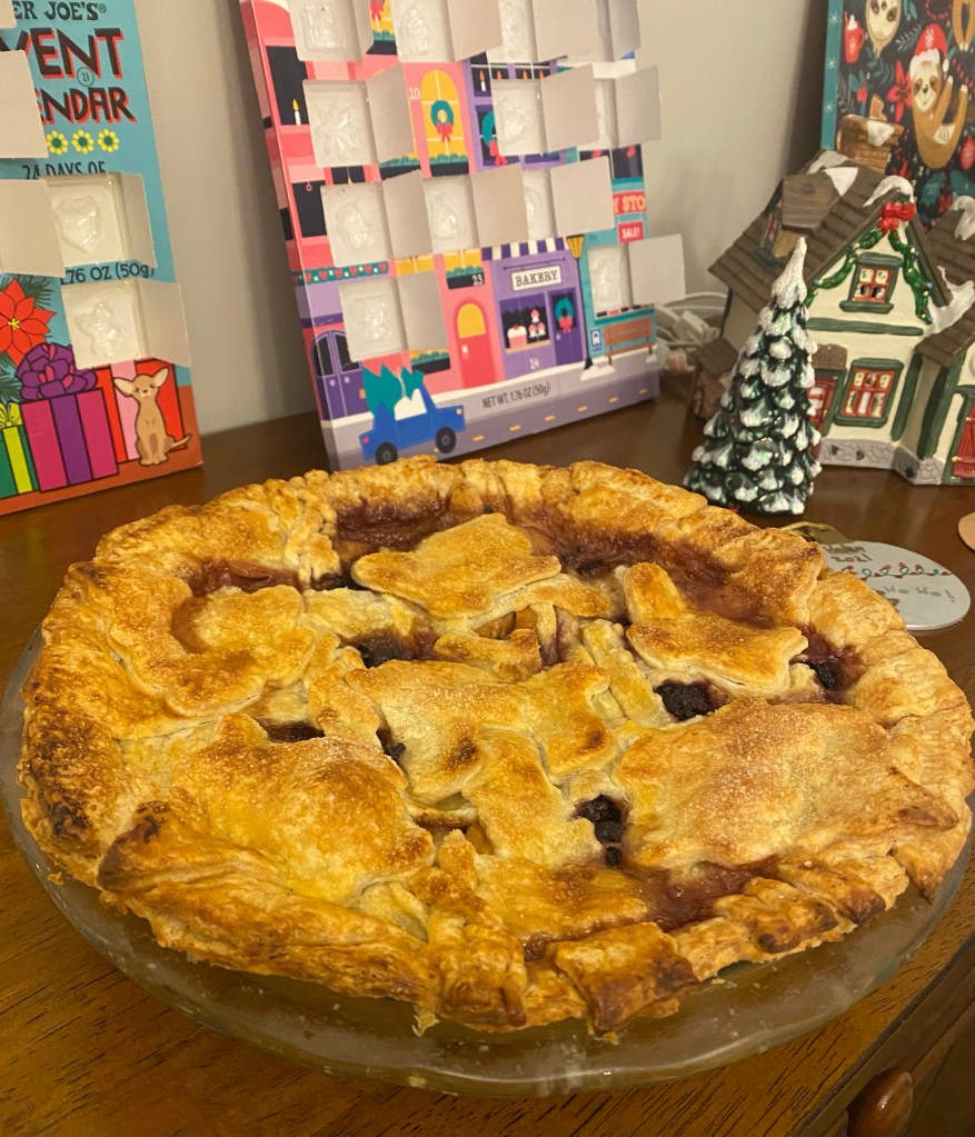 My friends moved houses across town. I wanted to make them something special. When I found large cookie cutters set with both a house and a holiday tree, I envisioned this pie. This pie consists of peaches and mulberries that I froze this summer.