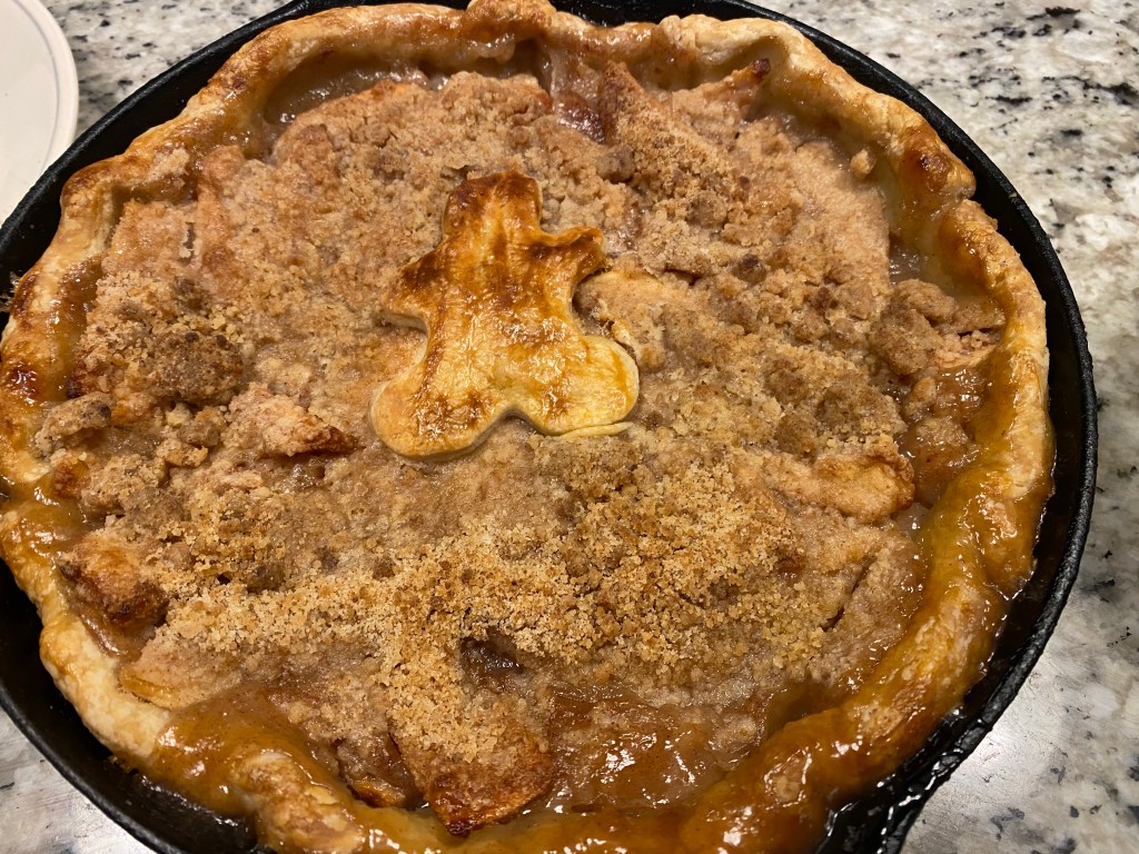 *Brush inside of cast iron skillet with canola oil. Place pie shell in the cast iron skillet and press into place. Form top crust either by rolling into place then crimping or by using a fork to make design. Place cast iron skillet with crust in the refrigerator to chill.