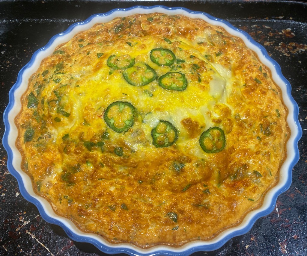 The quiche is the same crustless quiche that I have been making since the holidays. This morning I added an extra egg, onions, parsley, chicken sausage, and vegan mozzarella cheese. As an aside, the additional egg and ingredients increased the baking time by 15 minutes.