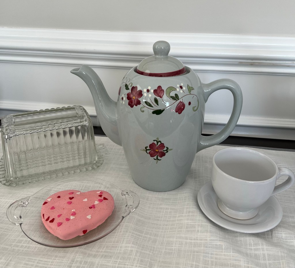 Today I’m scored this lovely Stangl Garland Tea/Coffee pot at my local thrift shop. Stangl was made from the 1930s – 1978 in Flemington, NJ. My mom had a Tea/Coffee pot when I was a kid as a part of her prized collection. I can understand as I’m completely in love with this piece of pottery. While I don’t have any other pieces, I used a white tea cup with a Fostoria plate and ribbed butter dish to round out the service. The lovely heart cookie was made by Swanksi’s.