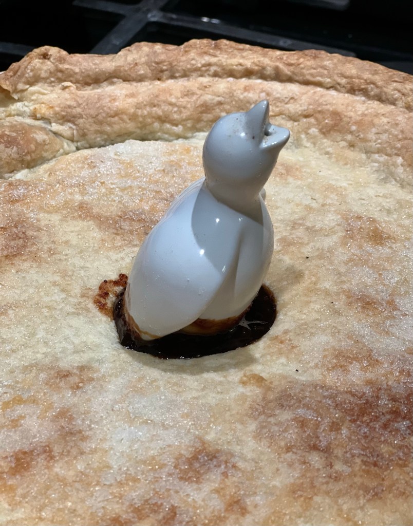 Once the filling is cool, fill the inside of a pie crust. I used a pie bird for decoration. However you can simply use cookie cutters to arrange a lovely top crust.